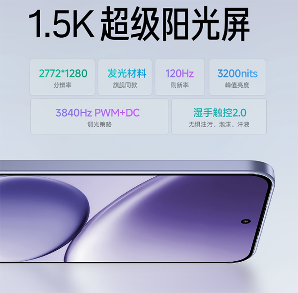 具體的屏幕上,采用6.83英寸1.5K超級陽光四窄邊直屏,支持120Hz刷新率,全局峰值亮度1800nit,局部峰值亮度3200nits,支持3840Hz高頻PWM+DC調光,濕手觸控2.0,不怕油污、泡沫、汗液。