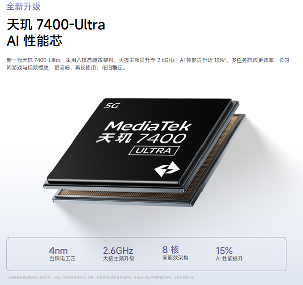 4納米,紅米Note15 Pro搭載的是聯(lián)發(fā)科天璣7400-Ultra處理器,采用的是臺積電4納米工藝。