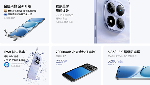 其他:支持NFC和紅外遙控,Wi-Fi6,立體雙揚(yáng)聲器(1115對(duì)稱雙揚(yáng)聲器,響度高達(dá)82.5dB,帶來400% 大音量模式),0809 X軸線性馬達(dá),藍(lán)牙5.4,USB2.0,支持IP66/IP68/IP69/IP69K防塵防水,單頻北斗(B1I)和單頻GPS(L1),公里級(jí)無網(wǎng)通話,預(yù)裝基于Android的Xiaomi HyperOS 2操作系統(tǒng)。