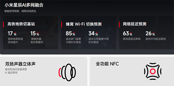支持,紅米Turbo4 Pro內(nèi)置小米T1S通信芯片,支持公里級無網(wǎng)通信和小米星辰AI多網(wǎng)融合,提供更快更穩(wěn)定的網(wǎng)絡(luò)體驗。