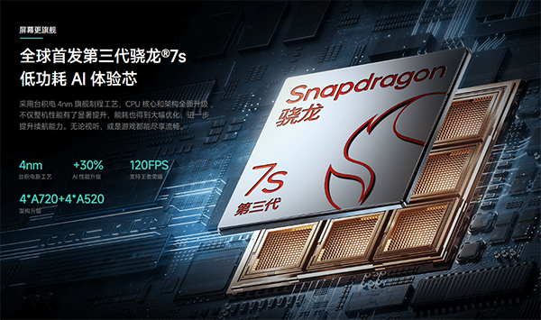 在性能上,該機(jī)全球首發(fā)第三代驍龍7s,采用臺(tái)積電4nm制程工藝,CPU核心架構(gòu)全面升級(jí),配置為1×[email protected]、3×[email protected]和4×[email protected]。與第二代驍龍7s相比,安兔兔跑分提升了25%,跑分接近80萬。