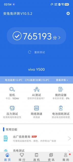 在安兔兔V10版本的測試中,vivo Y500的跑分達(dá)到了76萬分,這一成績在同價位段產(chǎn)品中表現(xiàn)非常出色,能夠滿足用戶對高性能的基本需求。