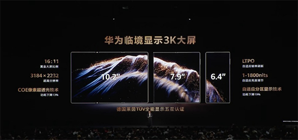 在這個(gè)屏幕方面,華為Mate XTs非凡大師采用華為臨境顯示3K大屏,屏幕供應(yīng)商是京東方,屏幕比例為16:11,分辨率為3184×2232,并搭載COE像素超透光技術(shù),功耗下降13%,支持1-1800尼特自適應(yīng)亮度調(diào)節(jié),并通過(guò)了德國(guó)萊茵TUV全能顯示五星認(rèn)證。