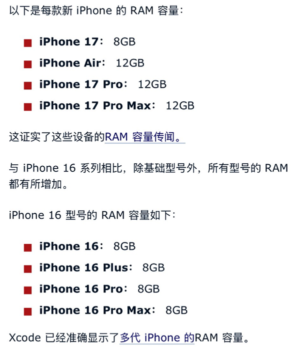 iPhone 17 Pro和iPhone 17 Pro Max從8GB RAM升級(jí)到12GB RAM,新推出的iPhone 17 Air直接采用12GB RAM內(nèi)存,iPhone 17標(biāo)準(zhǔn)版則保持8GB RAM內(nèi)存。