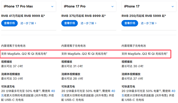 支持, iPhone 17、iPhone 17 Pro 與 iPhone 17 Pro Max支持MagSafe無(wú)線充電、Qi2和Qi無(wú)線充電、40W有線快充。
