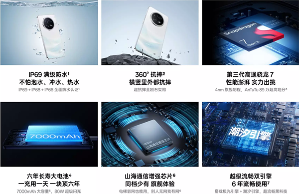 性能:搭載的是高通驍龍7Gen3處理器,另外還有山海通信增強(qiáng)芯片,還內(nèi)置有潮汐引擎;