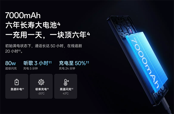 電池:7000mAh大容量電池,80W有線充電,兼容80W及以下超級(jí)閃充,44W三方融合快充,33W PPS,13.5W PD,13.5W QC充電協(xié)議;
