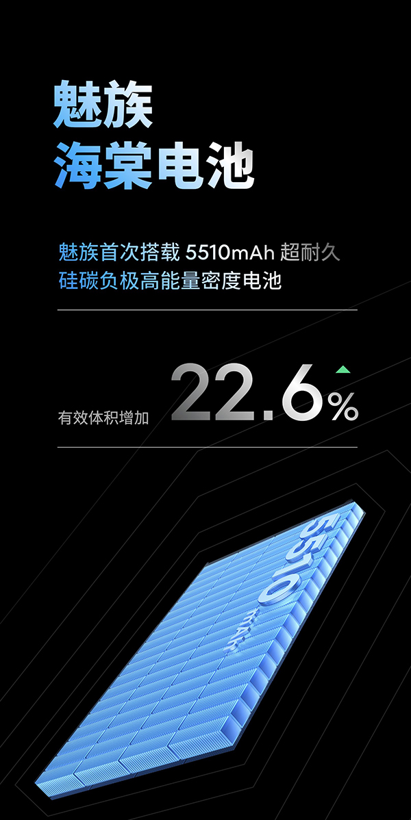 單電芯,魅族22配置的是5510mAh單電芯,并且是魅族的海棠電池。