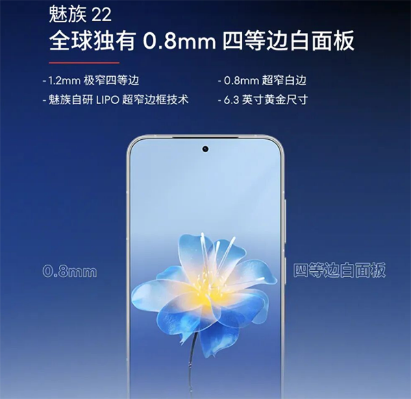 魅族22正面擁有極致視覺體驗(yàn),1.2mm極窄四等邊白色邊框,打造出 “1.2mm LIPO物理四等邊 + 白色面板” 小直屏最佳形態(tài)。