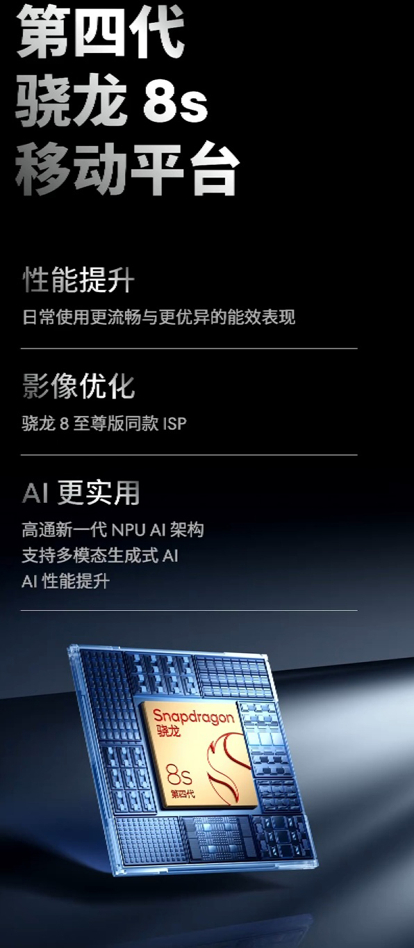 在性能上,采用的是高通驍龍8s Gen4芯片,這款芯片采用臺積電4nm制程工藝,CPU采用“全大核”架構(gòu)設(shè)計,擁有驍龍8Elite“同款”的GPU架構(gòu),配以LPDDR5X內(nèi)存+UFS4.0存儲規(guī)格,能滿足“大多數(shù)場景的需求”。