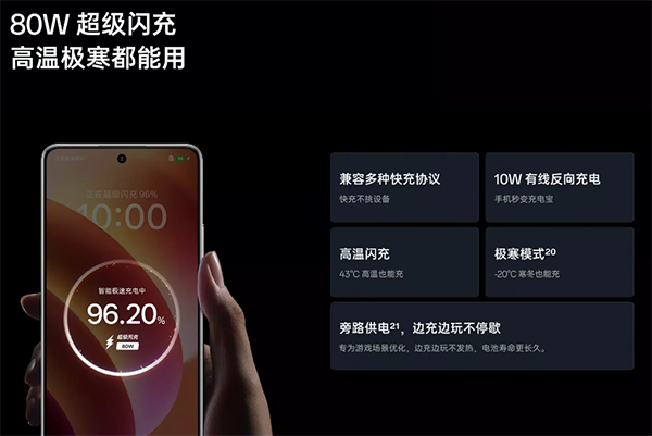 充電方面支持80W超級閃充,短時間內(nèi)即可快速回血,同時還支持10W有線反向充電,可以為其他設(shè)備應(yīng)急充電,以及高溫閃充/極寒充電和旁路供電等功能。