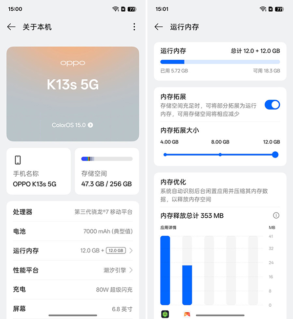 性能方面,OPPO K13s搭載了臺積電4nm制程工藝的第三代驍龍7移動平臺,并配備了LPDDR4X + UFS3.1的存儲組合,最高支持12GB+256GB存儲組合,還可擴(kuò)展至24GB大內(nèi)存。