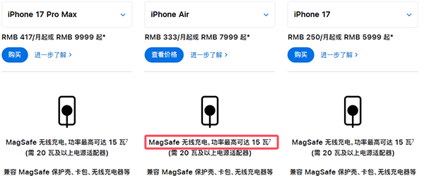 另外,蘋果iPhone Air支持MagSafe、Qi2和Qi無線充電,MagSafe無線充電功率最高可達15瓦。