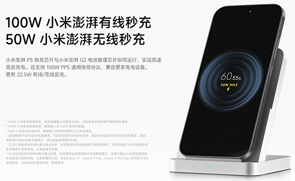 支持,小米17支持100W澎湃有線快充,以及50W無線快充。