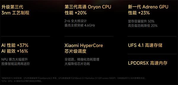 3納米,小米17首發(fā)第五代驍龍8至尊版芯片處理器,采用的是臺積電第三代3nm制程N3P工藝,單核性能提升超20%,SoC整體功耗降低16%,GPU綜合性能提升23%,AI性能提升37%。