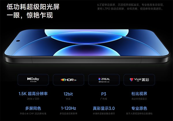 屏幕方面,小米17 Pro正面配備6.3英寸1.5K OLED低功耗超級(jí)陽光屏,采用先進(jìn)LIPO立體屏幕封裝技術(shù),手機(jī)邊框僅1.18mm,多場(chǎng)景峰值亮度達(dá)3500nits,最低亮度1nits,支持1-120Hz刷新率、P3廣色域、全亮度DC調(diào)光等。