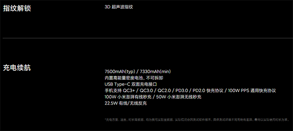 在充電方面,該機(jī)支持100W有線澎湃秒充(兼容100W PPS通用協(xié)議),其他品牌的快充頭也能給小米實(shí)現(xiàn)滿血快充,此外還支持50W無線秒充+20W無線反充。