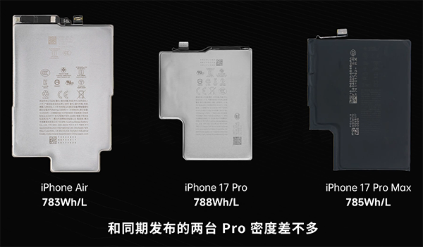 783Wh/L,蘋果iPhone Air機(jī)型的電池容量?jī)H為3149mAh,能量密度是783Wh/L,畢竟這個(gè)機(jī)型是超薄機(jī)型了,因此電池容量大小也是受限的。