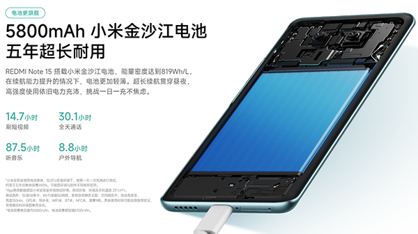 續(xù)航能力也是許多用戶選擇手機時的重要考量,小米REDMI Note15標準版內置5800mAh超大電量,并且是大家喜歡的金沙江電池。