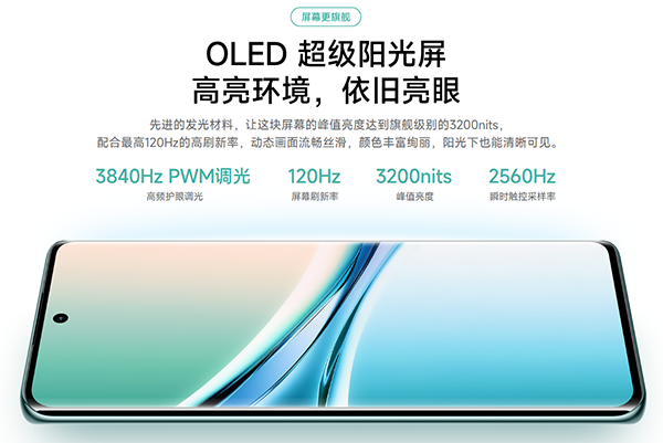 屏幕:尺寸是6.77英寸,OLED居中打孔曲屏,2392×1080分辨率,120Hz屏幕刷新率,240Hz觸控采樣率(2560Hz瞬時觸控采樣率),3200nits峰值亮度,3840Hz高頻PWM調(diào)光(80nits以下)+DC調(diào)光(80nits以上),12bit色深(687億色),DCI-P3 色域,屏下短焦指紋識別,節(jié)律護眼TüV萊茵三重護眼認證,濕手油手觸控;