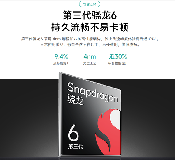 性能:搭載的是高通驍龍6Gen3處理器;