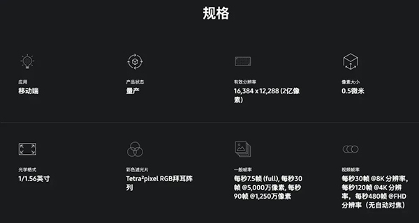 它的尺寸為1/1.56英寸,擁有16384x12288的超高分辨率,并將單位像素尺寸壓縮至0.5微米,是三星全球首款搭載了0.5μm超微像素的2億圖像傳感器。