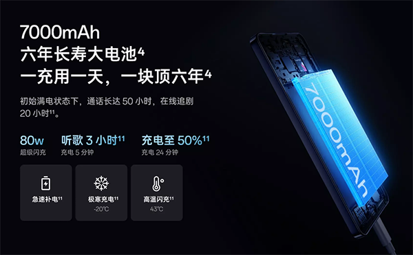 續(xù)航方面,OPPO A6 GT內(nèi)置7000mAh電池,初始滿電狀態(tài)下,可通話50小時或在線追劇20小時,配備80W的充電功率,充電至50%僅需24分鐘。