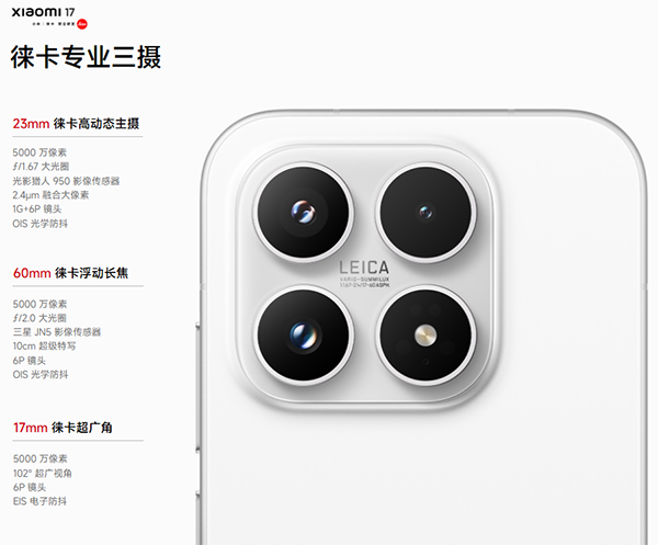 并且,這次的小米17標(biāo)準(zhǔn)版還配備徠卡光學(xué)Summilux高速鏡頭,搭載光影獵人950影像傳感器與新一代徠卡光學(xué)G+P鏡組。