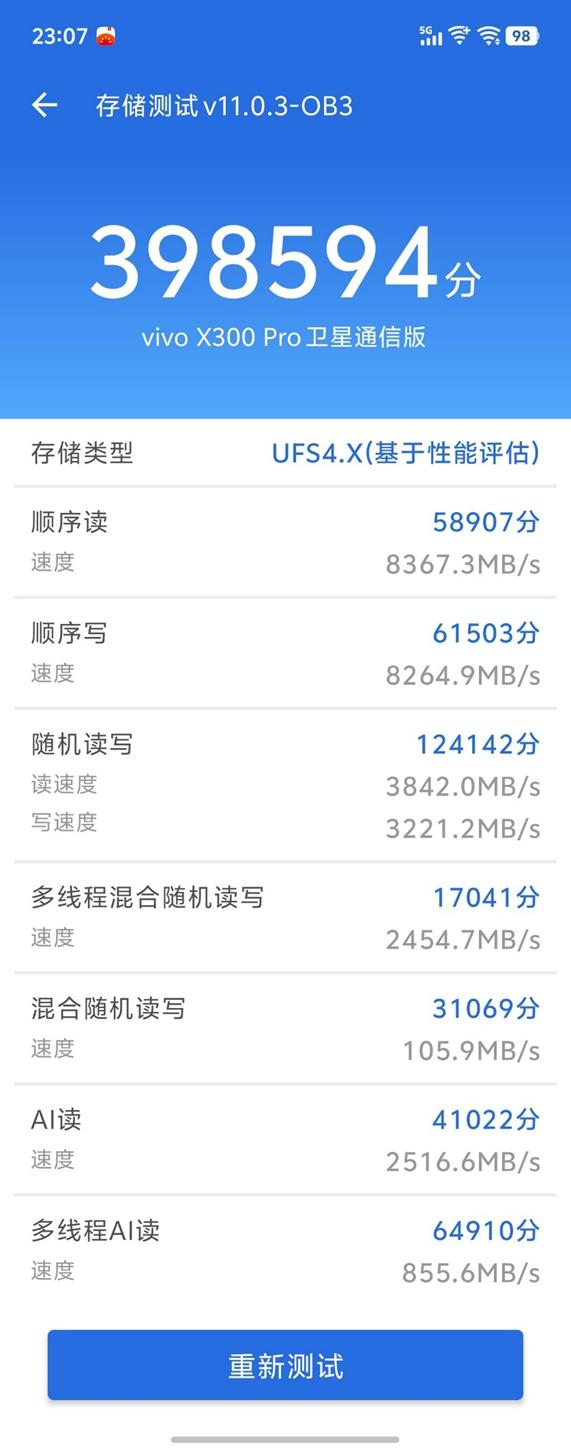 特別是該機(jī)采用LPDDR5X以及雙UFS 4.1陣列來(lái)搭配天璣9500形成性能鐵三角,儲(chǔ)存測(cè)試得分為398594分,在儲(chǔ)存性能上目前屬于頂尖水平。