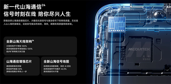 也就是說,OPPO Find X9 Pro配置了新一代山海通信,采用了全新山海天線架構(gòu),天線有效尺寸增加100%,高穿透頻段信號增強高達100%,徒步曠野網(wǎng)絡(luò)又快又穩(wěn)。