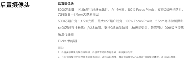 主攝像頭:5000萬像素,索尼LYT700傳感器,1/1.56英寸,OIS光學(xué)防抖,等效焦距24mm,f/1.9光圈,100% Focus Pixels,支持四合一2.0μm大像素輸出