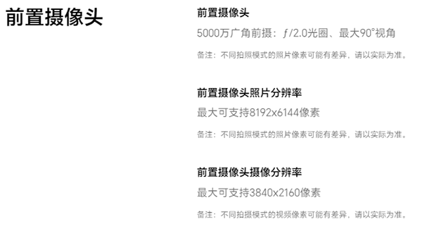 前置攝像頭:5000萬像素,90°FOV,f/2.0光圈