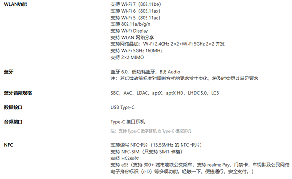 網(wǎng)絡方面,realme真我GT8 Pro支持Wi-Fi 7(802.11be)、Wi-Fi 6(802.11ax)、Wi-Fi 5(802.11ac)、802.11a/b/g/n。