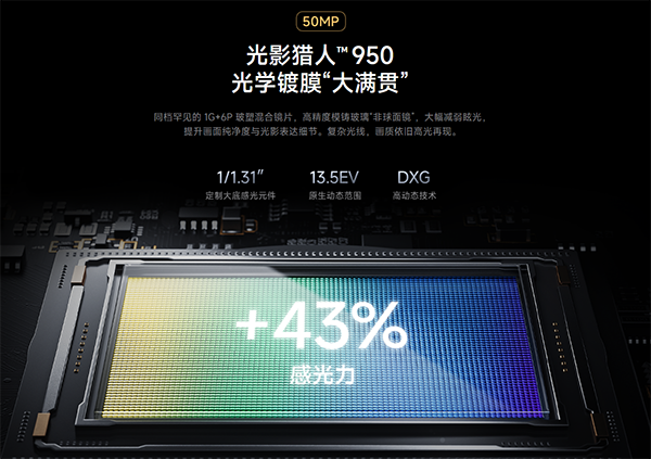 主攝像頭:5000萬像素,光影獵人950傳感器(即豪威OVX9500),1/1.31英寸,強化變焦時的動態(tài)范圍,1.2μm,13.5EV 原生動態(tài)范圍,F(xiàn)1.67光圈,OIS光學(xué)防抖,等效焦距23mm,4in1 2.4μm融合像素,1G+6P鏡頭;