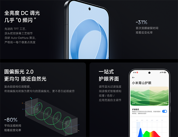 另外,這個(gè)小米青山護(hù)眼3.0」技術(shù)這次也沒(méi)有缺席,通過(guò)無(wú)頻閃全亮度的DC調(diào)光策略,搭配上圓偏振光2.0,升級(jí)優(yōu)化了護(hù)眼表現(xiàn),踐行了「醫(yī)工融合」的理念,讓科技更好的服務(wù)大眾用戶,保護(hù)大家的視力安全。