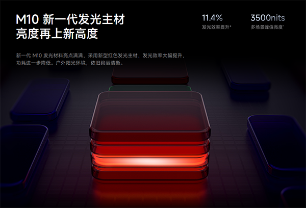 華星光電M10發(fā)光材料的OLED屏,采用新型紅色發(fā)光主材,發(fā)光效率大幅提升,屏幕供應(yīng)商是華星光電,并且是獨(dú)家供應(yīng)商。
