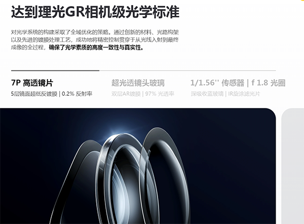主攝鏡頭:5000萬像素,索尼IMX906傳感器,1/1.56英寸,理光GR防眩光,OIS光學防抖,等效焦距24mm,f/1.8光圈,7P鏡頭,支持AF自動對焦,鍍膜+藍玻璃