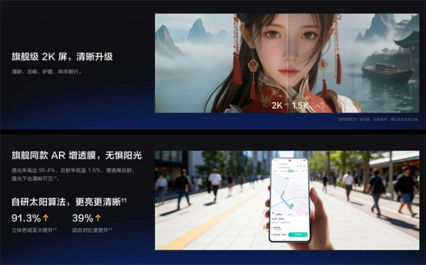 護(hù)眼方面,新機(jī)搭載圓偏振光護(hù)眼技術(shù),全新升級(jí)悅目護(hù)眼2.0、iQOO15 同款硬件級(jí)游戲護(hù)眼,動(dòng)態(tài)偵測(cè)游戲畫面,智能調(diào)節(jié)藍(lán)光量和亮度,支持類DC調(diào)光、2592Hz超高頻調(diào)光。