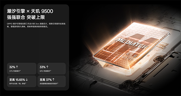 性能方面搭載天璣9500旗艦芯 + 獨創(chuàng)OPPO芯鏈與OPPO潮汐引擎,全系搭載全新ColorOS 16,AI雙鍵加持,還可享受與蘋果生態(tài)產(chǎn)品的無縫跨生態(tài)體驗。