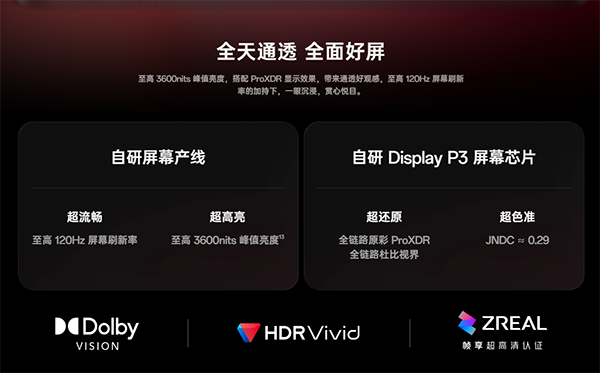 手動(dòng)亮度800nit,全局激發(fā)亮度1800nit,20%窗口峰值亮度3600nit,最低1nit亮度護(hù)眼技術(shù)。