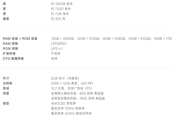 LPDDR5X規(guī)格內(nèi)存,UFS4.1規(guī)格閃存,另外不支持?jǐn)U展存儲(chǔ)卡。