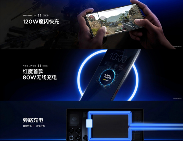支持,紅魔 11 Pro系列手機還紅魔首發(fā)80W無線充電,提供120W有線快充(紅魔11 Pro是80W有線快充),同時支持旁路充電,可實現(xiàn)直驅充電+充電分離特性。