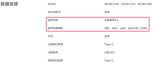 藍(lán)牙方面,該機(jī)配置的是藍(lán)牙5.4,并且支持SBC、AAC、aptX、aptX HD、LDAC。