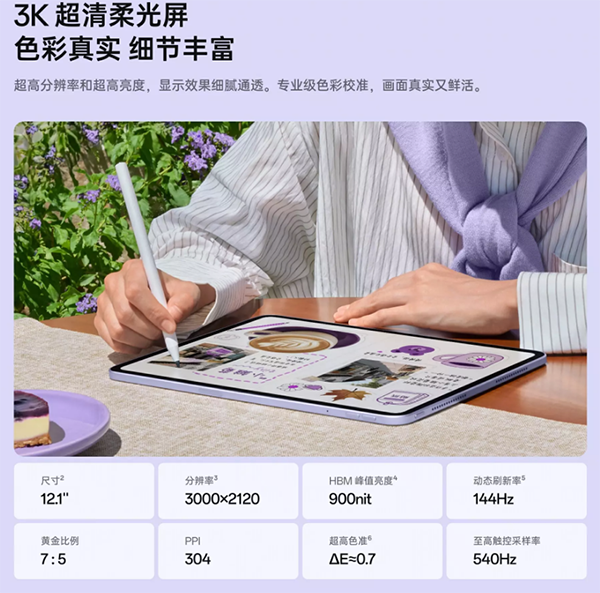屏幕:尺寸是12.1英寸,分辨率是3000×2120(屬于是3K級別),LCD屏幕,像素密度304ppi,最高144Hz刷新率,手動最高亮度600nits,峰值亮度900nits,deltaE≈0.7,全程DC調光,觸控采樣率最高540Hz,默認240Hz;