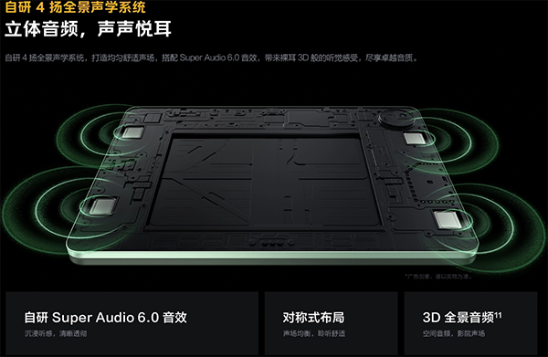 音頻體驗(yàn)方面,iQOO Pad5e搭載自研4揚(yáng)全景聲學(xué)系統(tǒng),四顆揚(yáng)聲器對稱布局,配合Super Audio 6.0音效算法,實(shí)現(xiàn)了均勻?qū)拸V的聲場覆蓋。