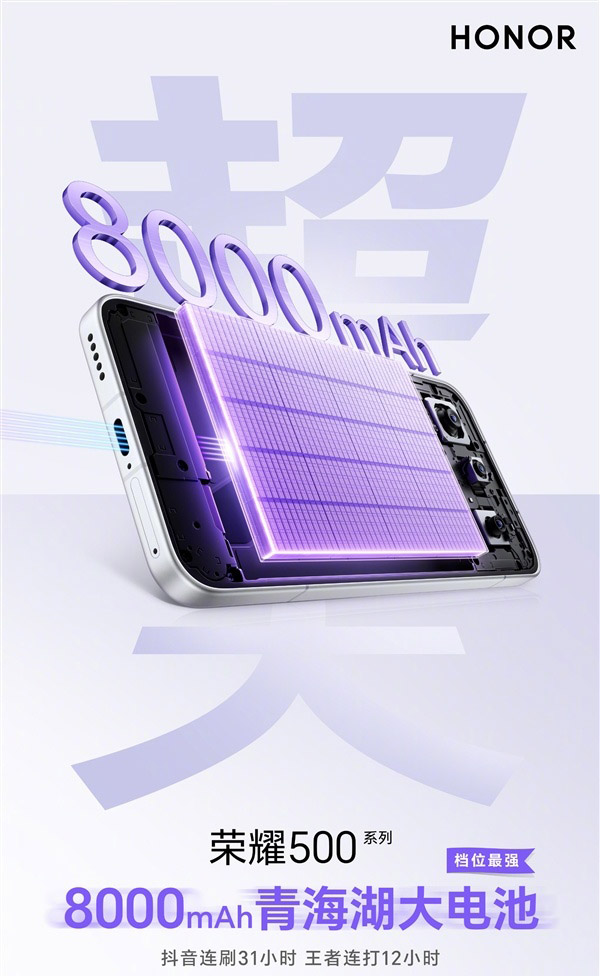 續(xù)航一直是智能手機的痛點之一,尤其是對于經(jīng)常外出或重度使用的用戶,榮耀500 Pro似乎決心徹底解決這一問題,該機配備一塊容量高達8000mAh的超大電池,相比上一代榮耀400 Pro的7200mAh電池,這一提升幅度可謂驚人。