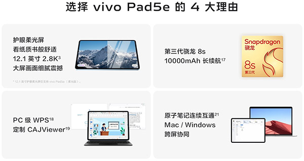 總的來看,這個vivo Pad5e是一款以學習辦公為主的全能平板,考慮到用戶長時間使用的需求,vivo Pad5e采用了更護眼的柔光大屏,而且配備了第三代驍龍8s平臺以及10000毫安時電池,確保性能與續(xù)航方面有著同級領先的表現,對于學生和辦公用戶來說,vivo Pad5e是一款非常值得關注的產品。