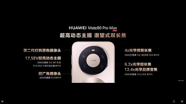 這次的華為Mate80 Pro Max擔任本代影像系統(tǒng)的最高規(guī)格,采用四攝RYYB體系,覆蓋主攝、廣角、微距與長焦四檔焦段,形成更完整的影像能力梯度。