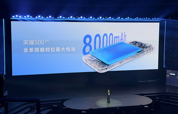 得益于水晶島的設(shè)計(jì)方案,榮耀500系列的厚度縮減到7.75mm,電池容量也增加到8000毫安時(shí)。
