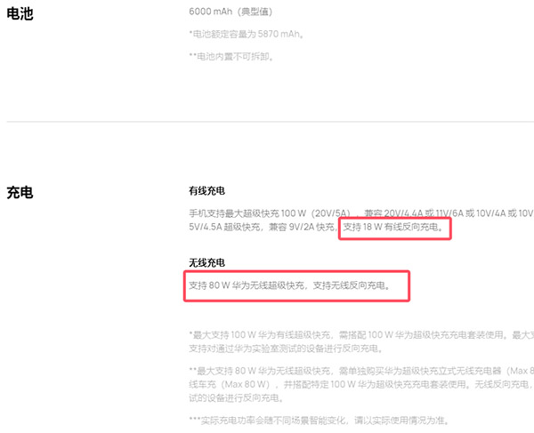 支持,華為Mate80 RS非凡大師配置的是6000mAh電池容量,并且支持100W有線快充,80W的無線快充,另外支持無線反向充電,以及支持18W有線反向充電。
